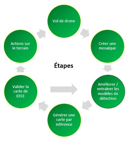 L’approche proposée par le CGQ vise à automatiser la détection des plantes envahissantes tout en s’appuyant sur l’expertise terrain pour garantir des résultats fiables et adaptés aux réalités écologiques de la Ville de Québec. Voici les grandes étapes qui ont permis de concrétiser ce projet :
